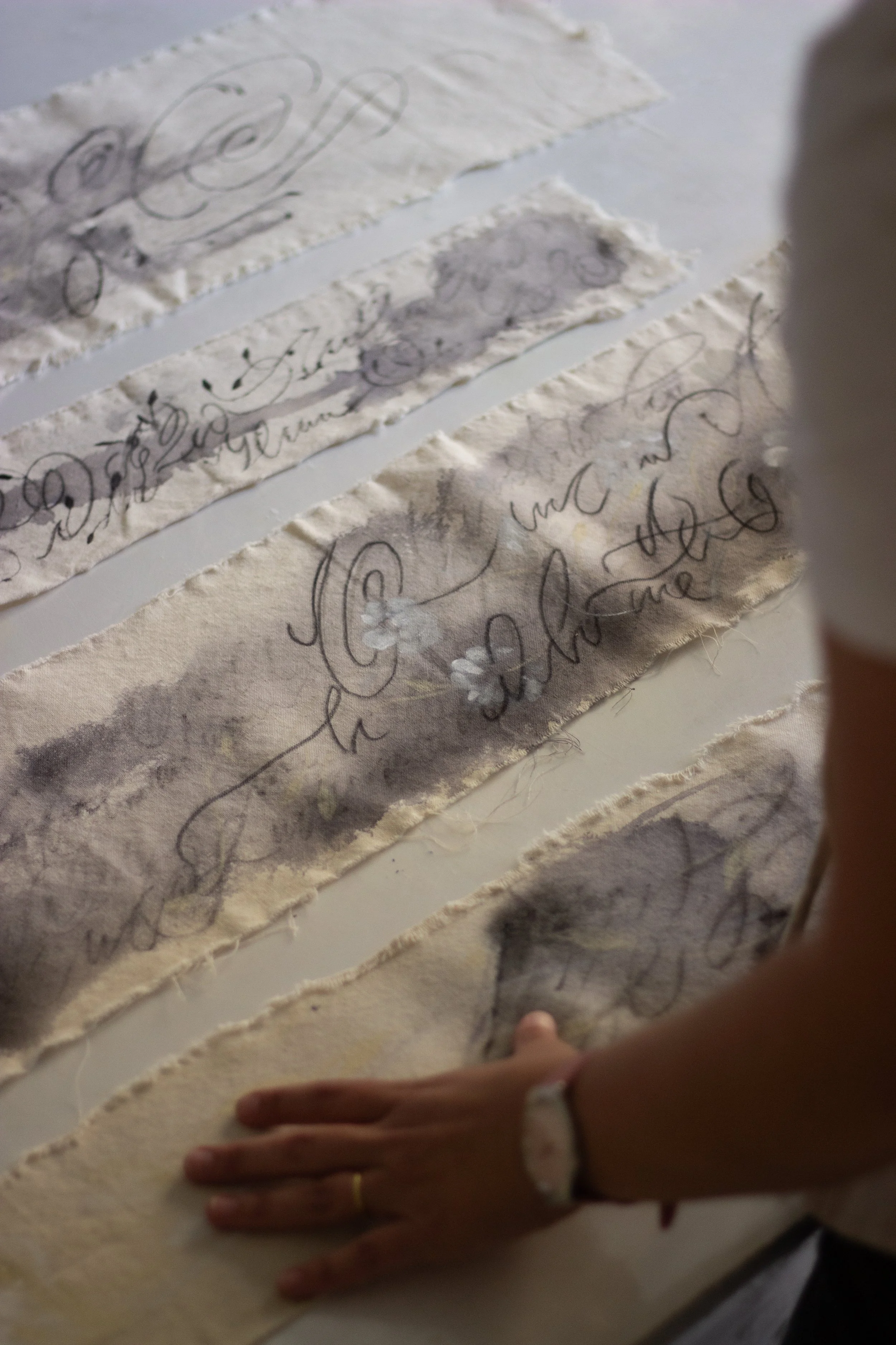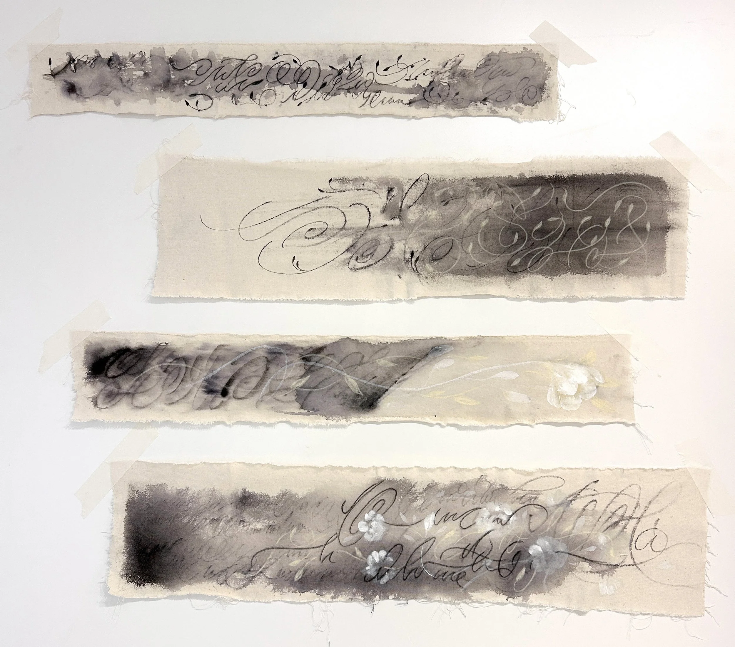 Caligrafía en tinta y pasteles sobre lienzo - 78 cm de largo y entre 10 y 20 cm de alto.